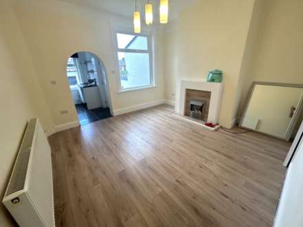 With laminate flooring, electric fire, understairs storage cupboard, radiator, stairs leading to first floor, UPVC double glazed window and archway leading through to the kitchen.