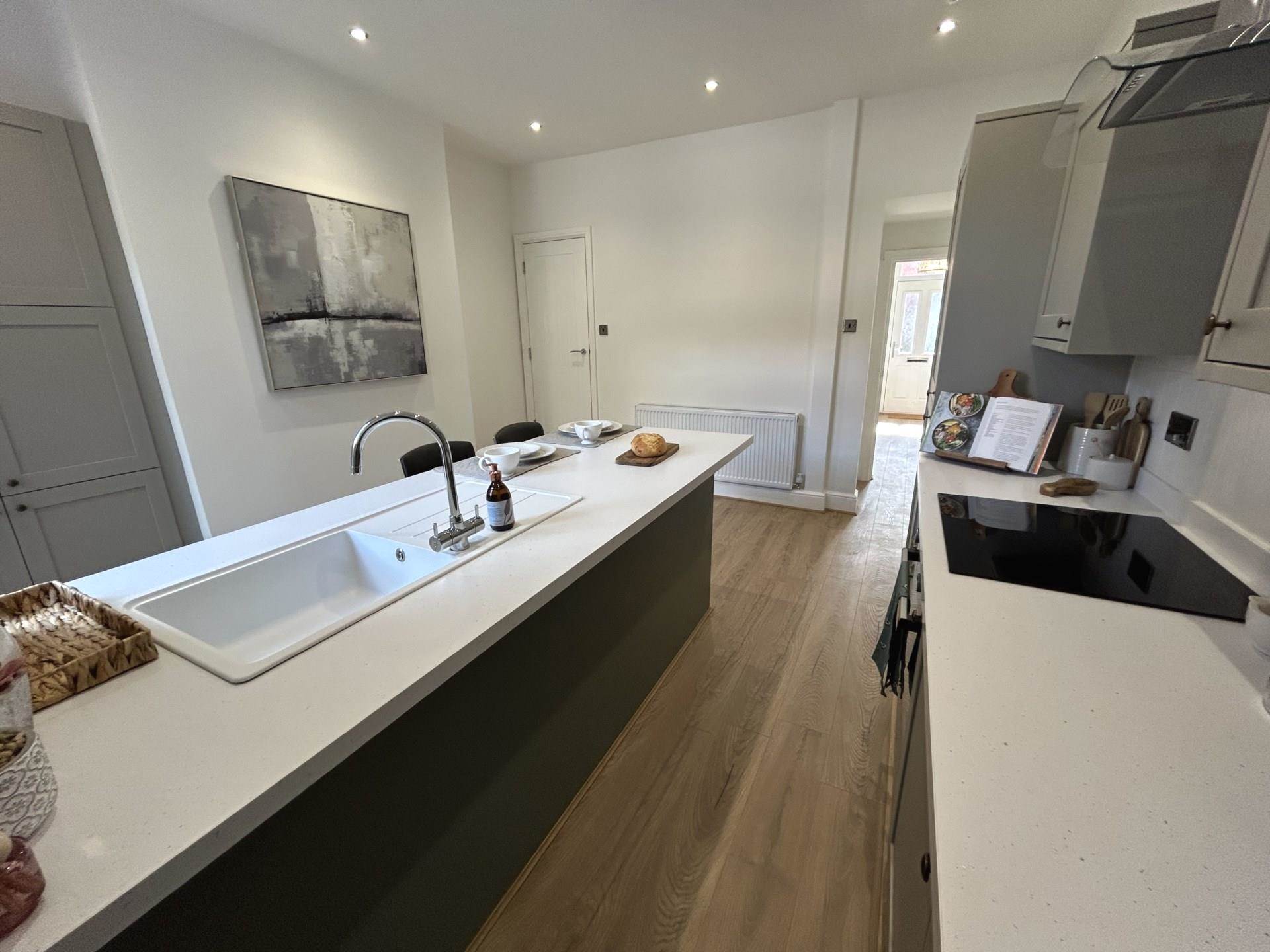 Newly fitted modern integrated units, including four ring electric hob, extractor hood above, integrated oven, fridge freezer, dishwasher and washing machine, composite sink units with mixer tap, breakfast bar, tiled splash back, under stairs storage cupboard, laminate flooring, access door to downstairs WC and UPVC double glazed patio doors to rear garden.