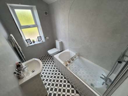 Modern bathroom suite comprising of bath with overhead shower mixer taps and vanity sink and unit, WC, spotlights, heated towel rail, tiled flooring, extractor fan and UPVC double glazed window to the rear.