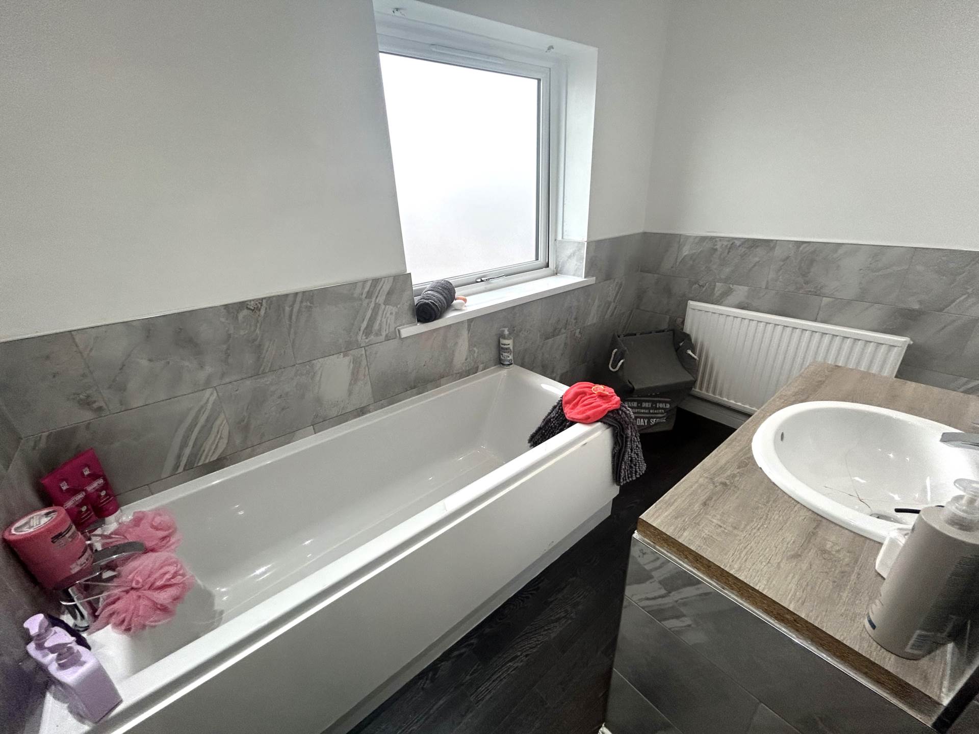 Comprising of bath with mixer tap, separate shower cubicle, WC, tiled walls, radiator, built in storage cupboard and UPVC double glazed window to the front.