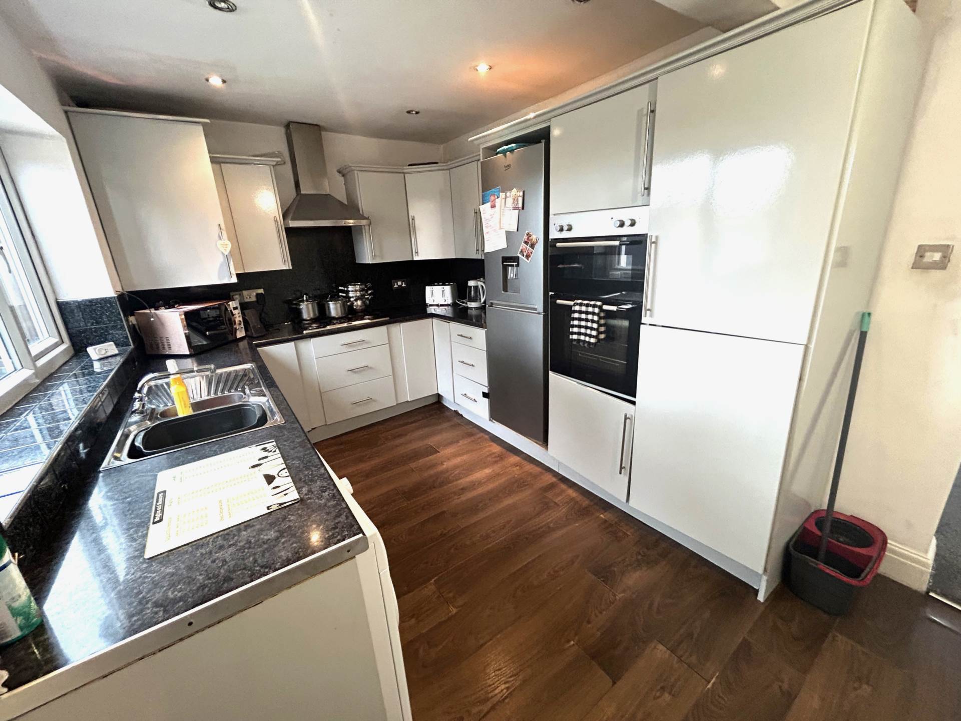 With a range of wall and base units, four ring gas hob with extractor hood above, double even, fridge freezer, plumbed for washing machine, stainless steel sink unit with mixer tap, spotlights, laminate flooring, radiator and UPVC double glazed window to the rear.